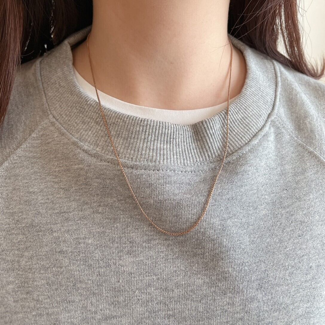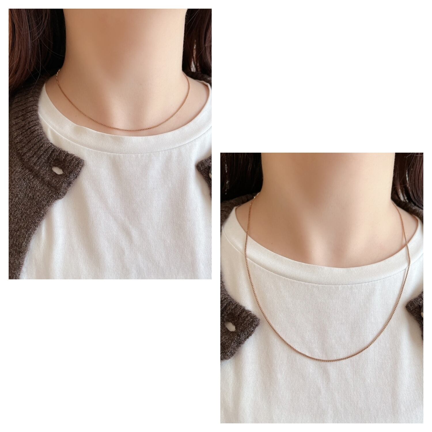 首に沿い顔周りをスッキリ見せることができるチョーカーから、トレーナーやセーターにあわせられるロングまで、付けたまま、お好みの長さに調整可能です。